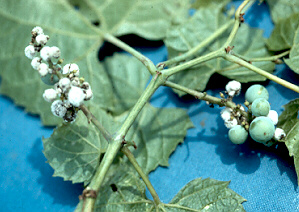 Plasmopara viticola, an oomycete native to America, causes downy mildew of grapes. It can be found attacking wild grapes every summer. But because it evolved along with its North American hosts (e.g., Vitis riparia), a biological balance has been struck, and the wild Vitis species aren't seriously damaged.