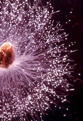 Other differences are revealed by the transmission electron microscope. In chytridiomycetes the axis of the flagellum is smooth (a whiplash flagellum), while in the hyphochytrids the axis of the flagellum bears many fine lateral filaments, called mastigonemes, that give it the name tinsel flagellum (the next illustration - the SEM picture below - shows both kinds of flagellum). These may appear to be insignificant differences, but biologists consider the numbers and kinds of flagella on zoospores to be an extremely conservative character -- one likely to remain unchanged over vast stretches of time, perhaps even hundreds of millions of years. This makes it an important indicator, which is amply confirmed by the ultrastructural differences illustrated above, and justifies the recognition of phylum Hyphochytriomycota. There are few well- documented species in this phylum, but Hyphochytrium catenoides is common in soil, and is often (like the chytrids, Spizellomyces and Chytridium) found in pollen when this is added to soil as 'bait' in the laboratory. This species may be of some importance in the natural biological control of plant pathogenic Oomycetes (see below), by parasitizing their oospores. No hyphochytrid has yet been seen to reproduce sexually.