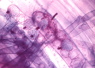Of course, this family also produces diagnostic oospores. A thick-walled, resistant oospore of Peronospora (growing on Chenopodium) is shown below (photo. courtesy of Jose Rodriguez)