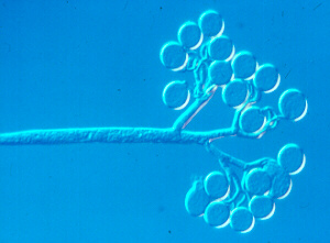 developing in chains from the tips of short, tightly packed sporangiophores (vertical