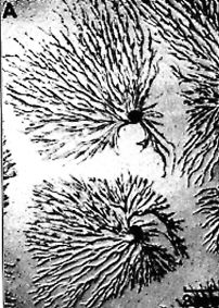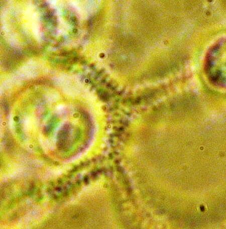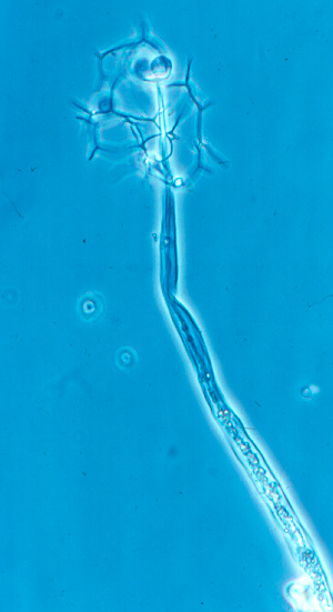 My second example of this strange phylum is Polysphondylium pallidum. Basically amoeboid during its growth phase, it produces a sorocarp that mimics the hyphomycete, Verticillium (see Chapter 4a), as the illustration below shows. Note that the outlines of the individual amoebae can still be seen after the branched sorocarp has developed (also note that these are not hyphae, and the lines are NOT septa). The 'cells' of the stipe and branches die: only those that reach tips and form the spores survive. Is this a form of altruism?