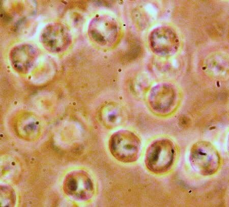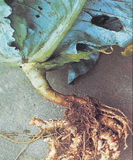 All members of this group are obligate parasites. Plasmodiophora brassicae produces uninucleate, biflagellate primary zoospores which penetrate a root hair of its host, cabbage (Brassica oleracea). Inside, they grow into multinucleate but still microscopic primary plasmodia. These eventually develop a wall and divide internally into uninucleate secondary sporangia. These germinate, releasing four secondary, biflagellate zoospores which leave the host. These may also act as gametes, fusing in pairs, but soon infect a root again, developing within host cells into multinucleate secondary plasmodia. At maturity, these can cleave into uninucleate cysts, each containing a single spore, which can persist in the soil for many years. This parasite stimulates the cabbage roots to become grossly swollen, a serious disease condition known as "club root" (shown below).