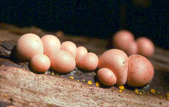 The very common aethalia of Lycogala epidendrum (above, left) may also represent a number of fused sporangia. It has pale spores and a pseudocapillitium (above, right) that place it in the order Liceales. My thanks to Prof. George Barron for several of the photos above.