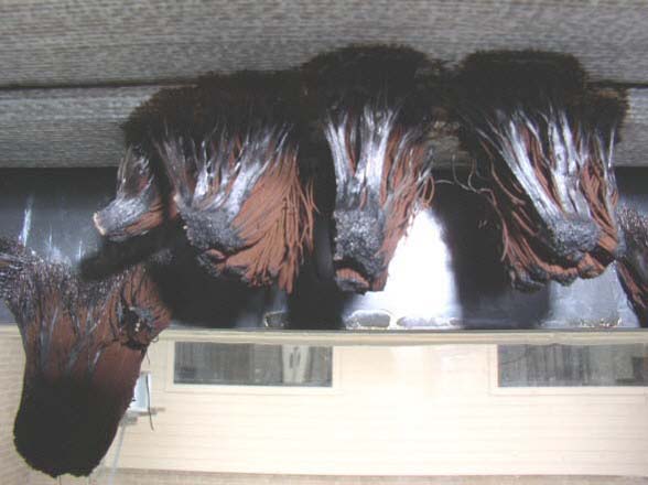 The tall brown mature sporangia (above, left) are those of Stemonitis fusca (order Stemonitales). On the upper right is a highly magnified view of the non-cellular capillitium and the dark columella that runs up the centre of the sporangium. The picture below is of a particularly massive fruiting of this organism that erupted in a rotting trailer. Spectacular, and no doubt unnerving for the owner...